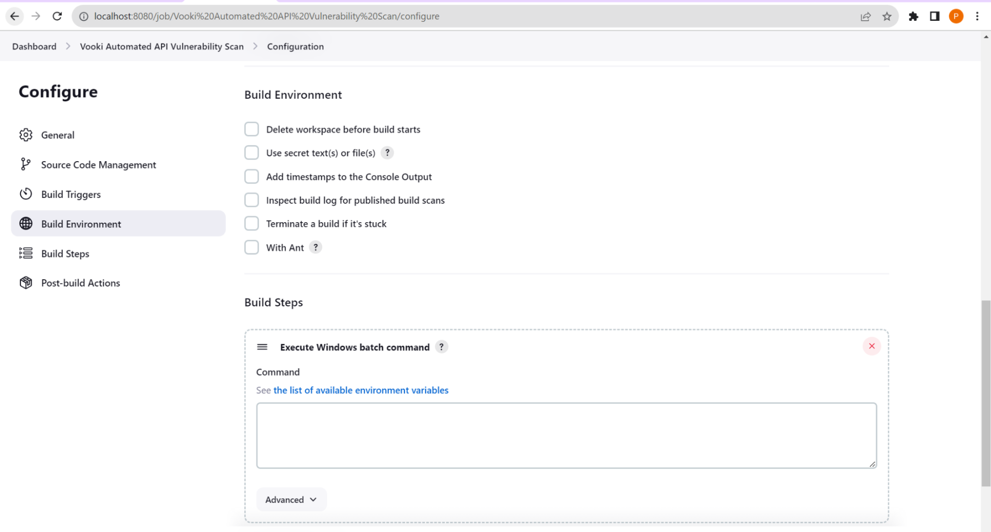 Once you click, “Execute windows batch command”, the text area will appear. Paste the command copied from Vooki and save it.